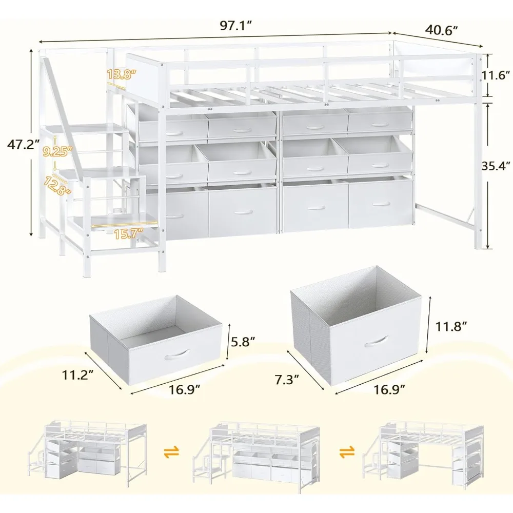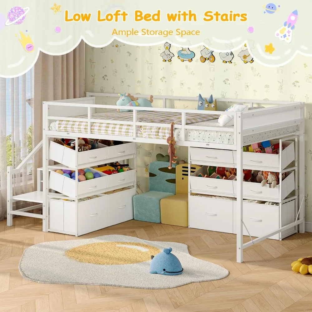 Low Loft Bed Twin Size with Stairs, Kids Loft Bed with 12 Storage Drawers, Metal Twin Loft Bed for Kids with Safety Guardrail